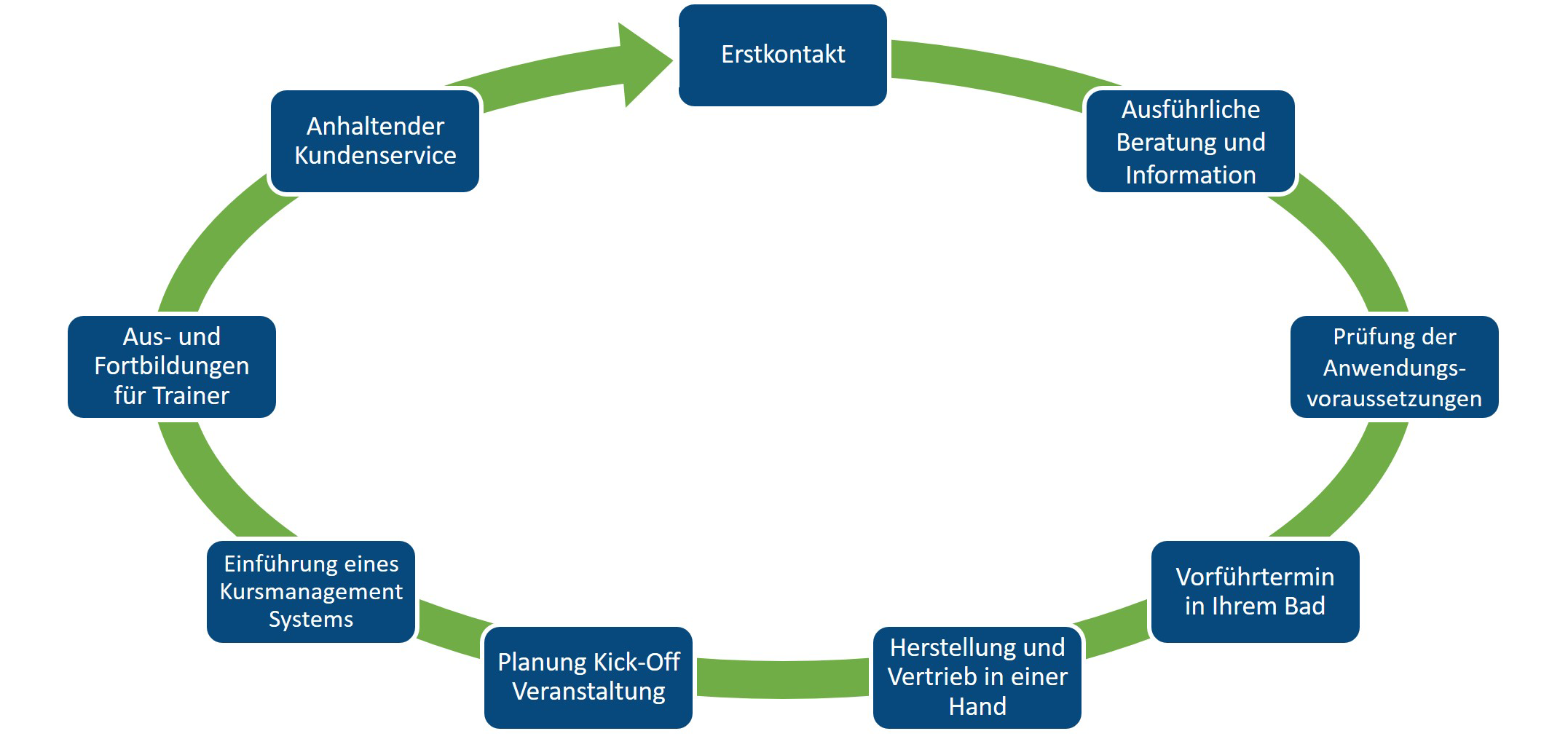 Ein ganzheitliches System - von der wissenschaftlichen Grundlage, der ausführlichen fachlichen Beratung unserer Kunden und Prüfung der Anwendungsvoraussetzungen vor Ort, bis zur erfolgreichen Umsetzung des AquaCycling Kurses für den Endkunden - macht uns aus.